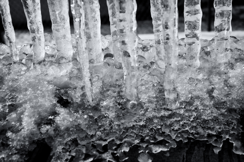 I tried experimenting today with macro by reversing my Super-Takumar 28mm lens on my K20D. The only problem was I don’t have a proper reversing ring and I was handholding the lens over the mount. Hard to do at such close range and it allowed light leaks. I was close on a few but most were pretty bad. After that failed attempt, I noticed this ice hanging from the bottom of my porch railing. I mounted the 28 properly and shot. Processed in PSE6 with Topaz Adjust plugin to enhance detail slightly followed by Nik Silver Efex B&W conversion and toning. K20D, Super-Takumar 28 1:3.5