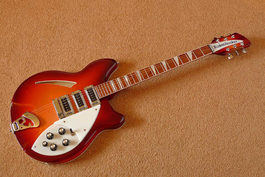 A couple of years ago I owned a Rickenbacker 370 guitar. The model 370 is essentially a model 360 with an added middle pickup. I bought it new at my local dealer, Guitar Gallery. I’ve always liked Rickenbackers. I thought they were cool, unique, and well-made guitars. Although I always liked the Jetglo (black) finish guitars, this particular one was finished in Rickenbacker’s signature Fireglo color. A nice red to amber(ish)”sunburst”. It was a great playing and sounding guitar. Ricks are a little quirky in design and feel compared to more popular brands of electric guitars. The necks have a different feel and the rosewood fingerboard has the finish applied over it, as opposed to the unfinished rosewood of just about every other guitar out there. The frets on the 370 are the small vintage type. The pickups, especially the vintage “toaster” models, are generally bright sounding. All of these elements cause a lot of players to be put off by the guitar when first handled. Ricks take a little time to get used. That being said, they do have a strong, almost cult-like following.
