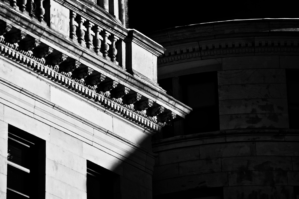I wasn’t really inspired by anything today. I think I’m going to have few days like this through the year. Took a drive around town but nothing jumped out at me. So I sat for a while looking at the buildings and I liked the shadows on these buildings. A basic black and white architectural detail study. PSE6 with Nik Silver Efex conversion. Pentax K20D, DA55-300