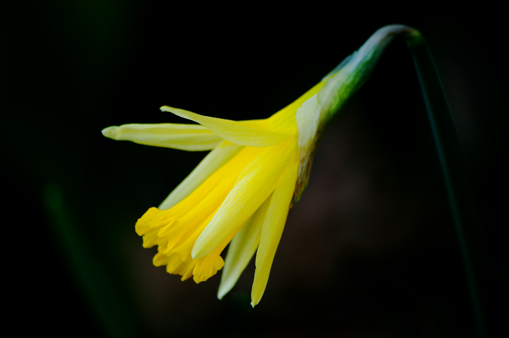 A flower! I stopped at an ATM and saw some daffodils in front of the bank. Grabbed a couple quick shots with my DA55-300, a quite competent flower lens. I know it’s nothing exotic but after shooting black and white cemetery pictures all winter, it’s a nice refreshing change. Expect some blossoms in the near future. Cliche perhaps, but I enjoy the challenge of making flower shots interesting. This shot suffered from a bit of noise due to a high ISO and underexposure from inadvertently using my spot meter (I know, I do dumb things like that sometimes). So I tried a trial of Topaz DeNoise and it worked wonders. I may have to invest in it someday. I do like the dark background though. I did some burning around the edges to enhance only the flower. Pentax K20D