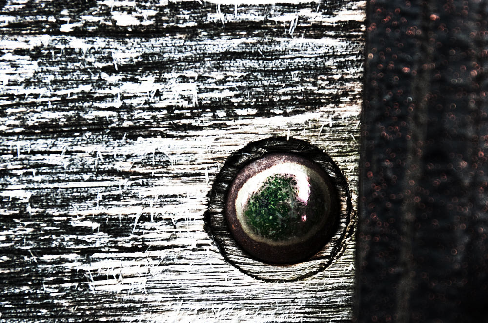 … hoping, MAYBE, that there would be some sign of spring, but it looked like February without the snow. No buds, no leaves, mud, dead grass…..aaargh! The other night I was looking in some of my photo files from last year at this same week and there are pictures that I took in the park that show spring blossoms and bright green grass. It’s crazy how winter is still hanging on in my area this year. Anyhow the park was so ugly that I had to look for photo subjects in little tiny areas instead of the big picture. Narrow my vision. It’s not a pleasant looking park by any stretch of the imagination, even on a perfect summer day, so I had my work cut out for me. Near one of the entrances to the “walking path”, which is just an area cleared of trees through some pretty scraggly woods, there is a weathered and broken bench. It has a dedication or donation plaque on it but it’s faded beyond recognition, so I don’t know of its significance. It certainly can’t be used as a bench anymore. The bolts holding the slats to the frame caught my eye because of the subtle metallic color against the gray weathered wood and I took a few shots expecting that I would find a better photo of something else later. That never happened, so I worked with the few shots I had and, in the end, actually liked the abstract look to it. Pentax K20D, DA17-70