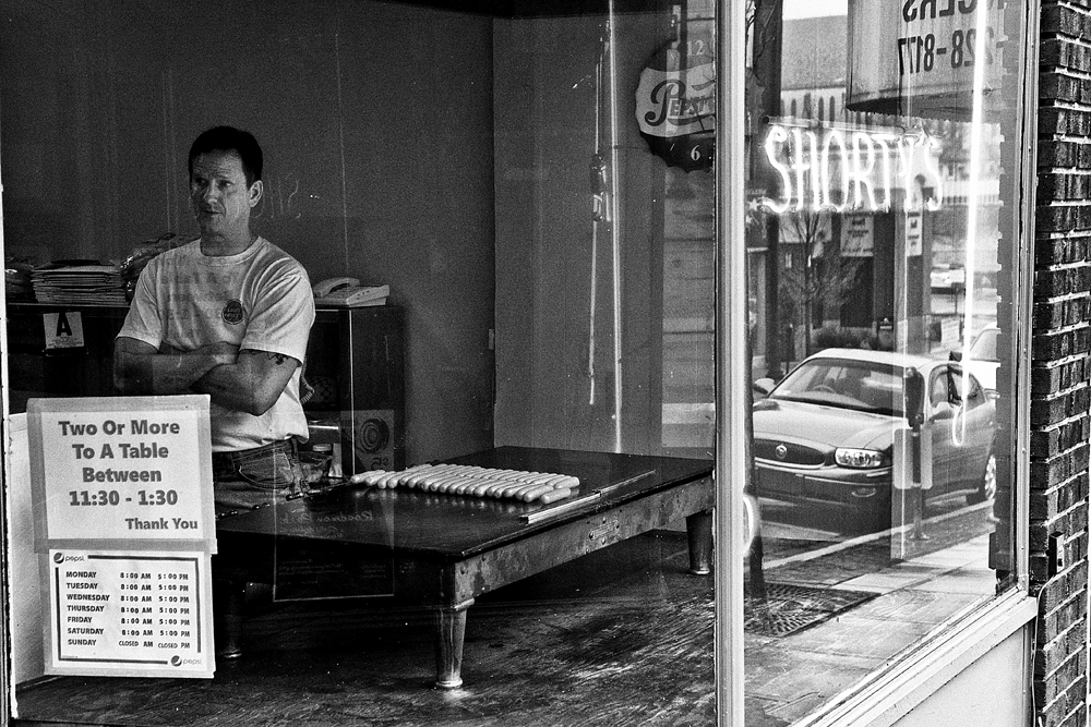 Through some comments I’ve had with Nathan Stitt about street photography and a recent discovery of the work of John Angulat, I have a renewed interest in that style of photography. I’ll be the first one to admit that I am not a street photographer. First of all, I don’t live in a large city where most really cool street photography is done. Photographers are practically invisible in large city areas because of the greater amount of people who have their own tasks at hand and don’t care or notice what others are doing. The photographer is able to blend in and take his time surveying a scene or waiting for a moment to capture. As the towns get smaller and the population thinner, the photographer stands out a little more. In my town, I’m often looked on with suspiscion when I’m shooting photos so I try to limit my public exposure. Although when most think of street photography they think “people” photography, that’s not always the case. A lot of good street photos do have a human element but a lot of times the person is not always the main subject of the photo. To me it’s the capture of the interaction between people and the urban environment that makes for good photos.