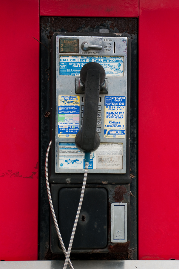 I don’t really notice payphones much anymore. Most likely there are fewer of them around, and I do sometimes notice where some used to be. It usually looks like someone just ripped the phone away from its mounting and that’s the way it stayed – wires dangling and only a shadow of the phone remaining. I was at a gas station today and noticed this phone. Of course the red surround caught my eye first, then I noticed the weathered look of the phone. Nothing too elaborate photographically but a nice touch of nostalgia. I remember carrying a pager for my job and having to find a payphone to call back to the office. That setup worked fine with me. I liked it better than I do now with cellphones and people thinking they can contact you at anytime and you’re assumed to be able to answer. My job got done then, even better than now because nobody bugged me. Plus with the payphone I couldn’t talk while driving. It was a good excuse to stop at a store, get a drink, relax, and then call the office ;-).