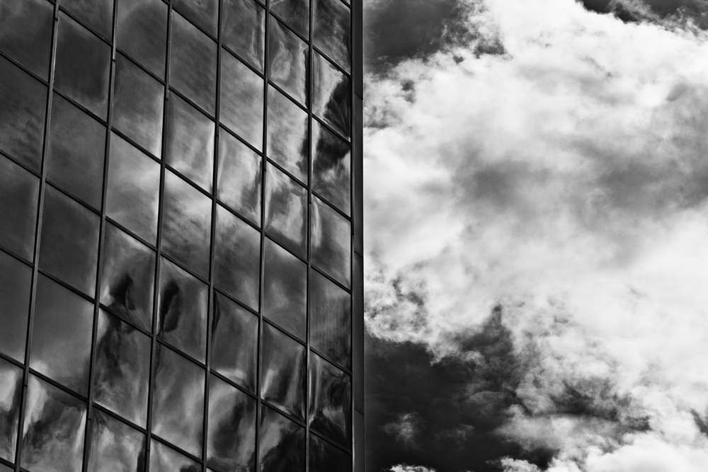 I love contrasty images. The symmetrical incongruity of the geometric vs. the organic is brilliantly captured in this image. The reflection of the latter in the former is like icing on the cake.
