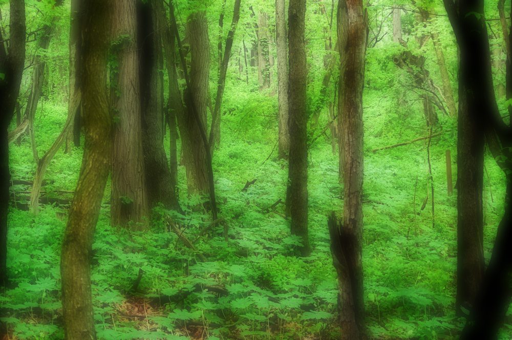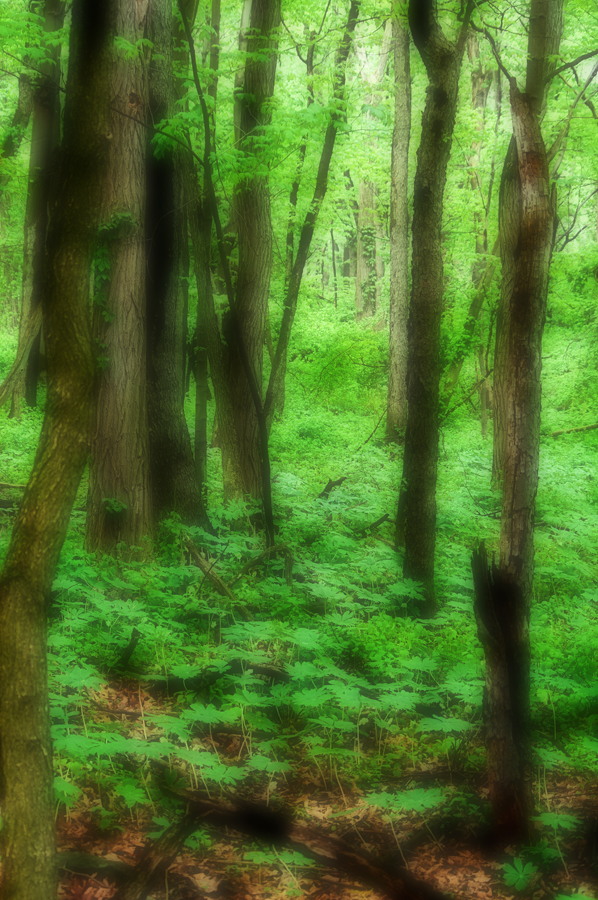 Surprise, the rain is back. Looks like another seven-day stretch. Had a nice hailstorm this afternoon and I took a shot of my windshield:-(. I know, I know – it’s lame, but it’s all I have right now. I also drove through the park and although there wasn’t much to shoot I took a few shots into the woods. I liked the lush green but the woods are pretty gnarly so I tried an orton effect to camouflage the rough stuff. I do like the warmer weather but I am getting a bit tired of green already.