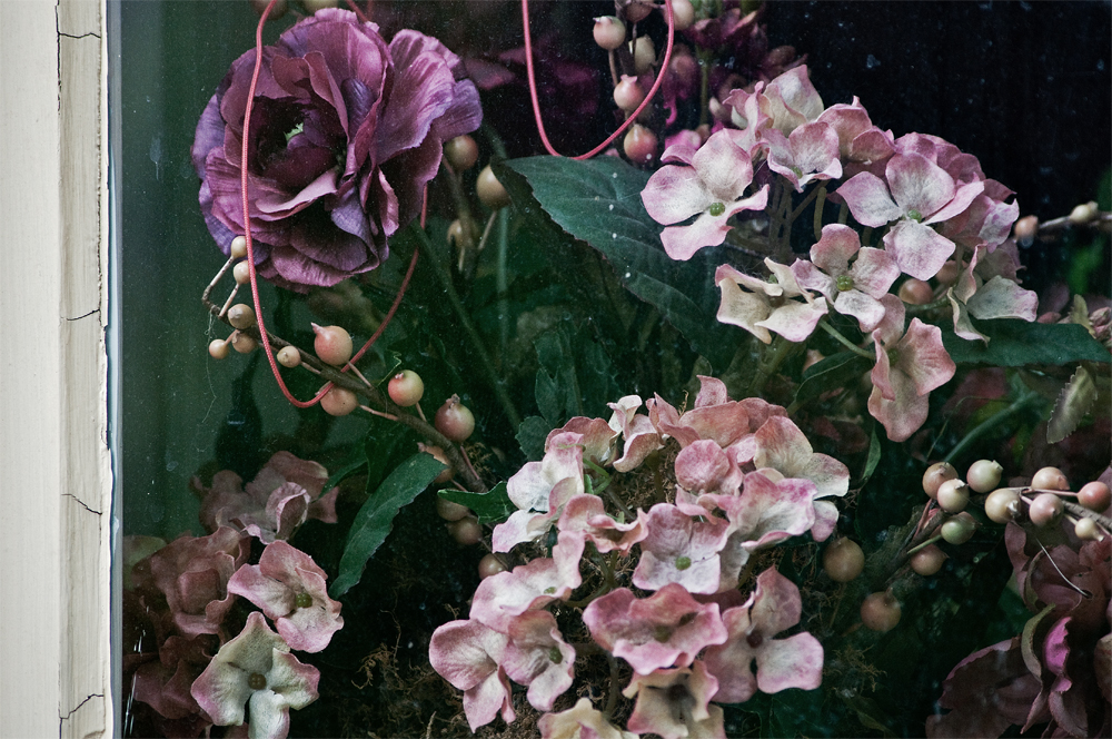 Well, all of my daily posts are shots of things I’ve seen that day. So I guess today isn’t any different. I live in such a dynamic, colorful area that it’s easy to take wonderful photos. Okay, that was a joke. It’s actually difficult to take photos around here that are somewhat interesting to view. That’s why I try to look for abstracts and details most of the time. The big picture just isn’t here. So, that being said, here’s todays images. A balloon seen floating through a parking lot. Silk flowers in a window of a florist. A black beetle on a wall. White flowers beaten down by the rain. A power pole against stormy clouds. Whew! That’s quite a lineup! Until tomorrow, cheers!