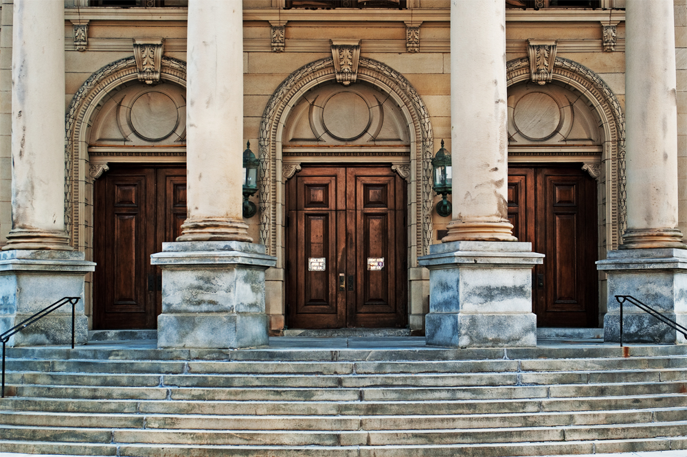 County seat that is. I didn’t have much to shoot today. Didn’t really try. So when I was driving through town I thought I would see if there was anything interesting. I liked how the metallic signs on the courthouse doors were almost glowing and, it being Sunday, the streets and sidewalks were deserted. A simple straightforward shot of the front of the building taken with Pentax K20D and DA17-70. I played around a little with curves and contrast in Photoshop to enhance the textures. I like the coldness of the steps compared to the warmth of the building and doors. Click on the pic for best view.