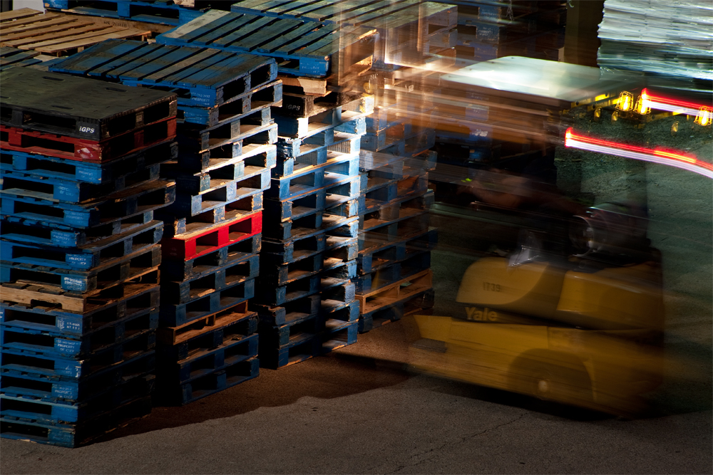 Running late again. I’ve seen these skylights on the Wal-Mart roof plenty of times at night and always thought that there may be a shot there. I like repeating patterns. What I didn’t notice before was all of the distractions (wires, vents, lights, HVAC, etc.). So it was tough to get even a little bit of a pattern from my vantage point. I did the best with what I had to work with. While I was there I saw a guy on a forklift stacking some pallets. Woo-hoo… action shot! Both with Pentax K20D and DA55-300.