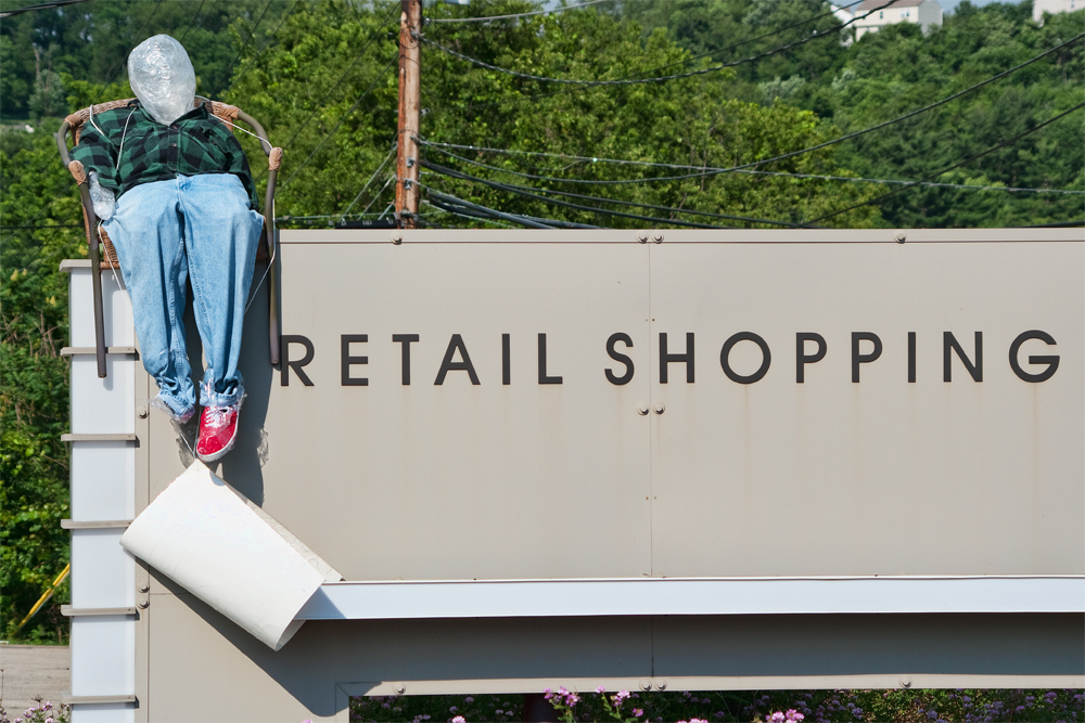 I noticed this dummy on a sign for a closed shopping center today. I drive past that way quite a lot and never noticed it before so someone placed it there recently. The dummy had a sign of some sort but it was folded over and I couldn’t see what it said. I like to think it’s a type of protest to the shopping center. The Foundry shopping center was constructed about 5 years ago with what promised to be a real nice center with walking areas, fountains, etc. Massive amounts of earth work took place to level a hillside which was once a rolling farmland. When it opened with a new JC Penny store and later a few other stores it was basically a strip mall with almost no other landscaping done. After a while I noticed that NO work was being done on the site and I suspected financial problems for the developer. It wasn’t long before I found out that was the reality which was followed by an unstable foundation under the open stores resulting in cracks and the eventual closing of the stores after being open only a few months. And that’s the way it stands today. A scarred and deserted “brand new” strip mall. There is only a Max and Ermas restaurant on site that remains open.
