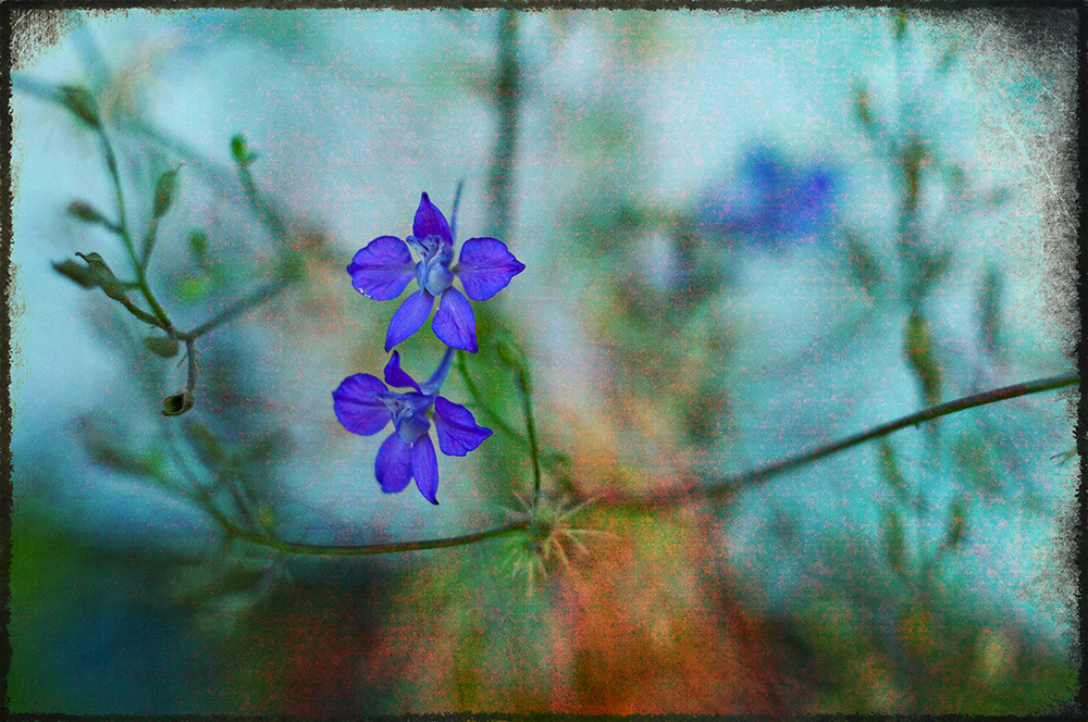 I took a photo of my neighbors flowers on my way out today just to have a shot “in the can.” After I ran some errands I uploaded the pics to see if I had to go back out and do some shooting. When I saw this particular image I thought it would make a good texture shot. I browsed through my library of textures that I have from various other artists trying to find just the right one, but a photo I took earlier in the year became the main texture. It was a severely underexposed, blurry moving camera shot of some trees that had a nice blue color to it. The photo was destined for delete but I remember thinking that it could make a good texture overlay someday. Good thing I kept it! When I pumped up the levels on it the noise increased and so did the orange color. I played around with various layer styles and opacities until I liked the result. I did add a SkeletalMess border texture from my files to frame the image, somewhat. Pentax K20D, Super-Takumar 50mm.