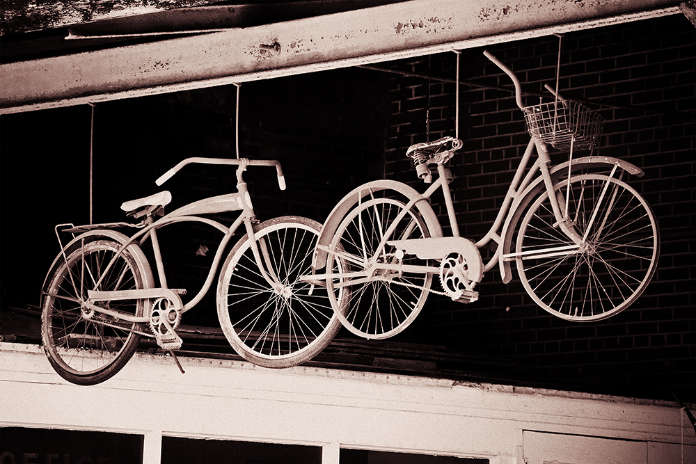 I often take photos of old cars because, well,  I like them. Not nicely restored cars at a show but old, aged, weathered cars. There is something about the lines of old automobiles that I find interesting mixed with the patina of years of neglect.  But I came across an even earlier form of transportation today for my 365 photo. I have to give credit to my wife who saw the bikes first. We were driving through a town and she looked down an alley and said there were “some old bikes hanging from a roof.” Without hesitation and without seeing them, I made the next turn to go check them out. I am glad I did. I think they look pretty cool. I thought I would do a black and white version to show only the basic essential elements. I added a copper toning to enhance the vintage vibe a little. Pentax K20D, DA55-300.