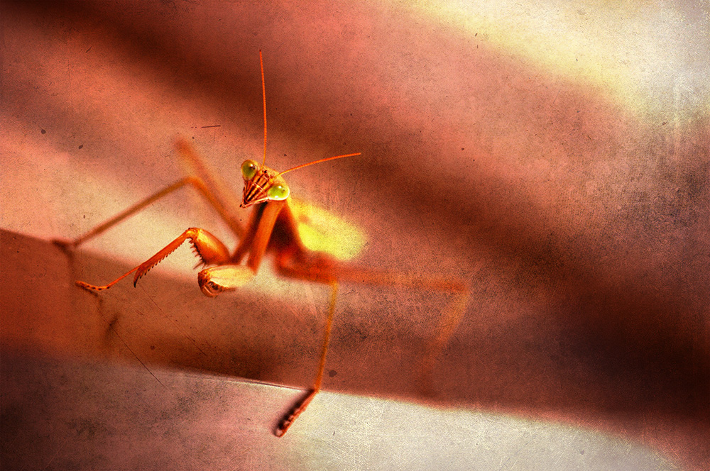In another processing mood today. I took a few passing shots during the day and instead of going out after work and trying to find a photo I decided to play around with what I already had. The mantis I saw when I stopped to wash my truck this evening. It was hanging out on a window frame near the change machine. The cat I saw this morning as I was leaving my hotel. It was still fairly dark out so I did an intentional slow shutter speed, moving camera shot. I played around with some textures on both of the images along with various levels and opacities. Hope you like my creature creations! Pentax K20D, DA17-70, DA55-300 (cat).