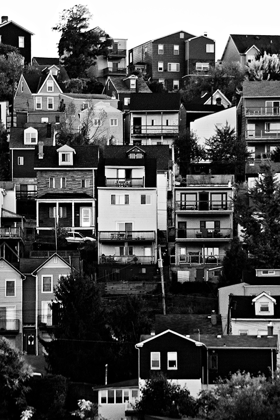 If there is a word that describes today, it would have to be traffic. There seemed to be heavy traffic everywhere today. Just getting around, anywhere, was a chore. My wife and I left the house late in the afternoon and I thought we would go into Oakland area of Pittsburgh to try to some architecture photos. Unfortunately on our way there we hit a heavy backup on the highway due to construction. Three lanes of heavily traveled interstate reduced to a single lane. It took an hour to travel the six-mile stretch! After getting out of that fiasco, I made the wrong decision of having an early dinner before trying any photography since I thought it would take a while getting around the city. We were able to get into the restaurant easy enough only to find it full of people traffic. It, like every other restaurant we passed, was packed already. It seemed like everybody in the area was doing the same thing, either stuck in traffic or eating out. Dinner ended up taking longer than I imagined and by the time we got to our car the light level was already getting low. Before I got in the car I peered out from the parking garage and saw these houses on a nearby hillside. I thought I would take a photo of them “just in case” and I’m glad I did. After sitting in even more traffic on the Southside, I scrapped the architecture photography in Oakland idea as it was already getting too dark. Instead, I thought that I would try some “artistic blurry” shots downtown.