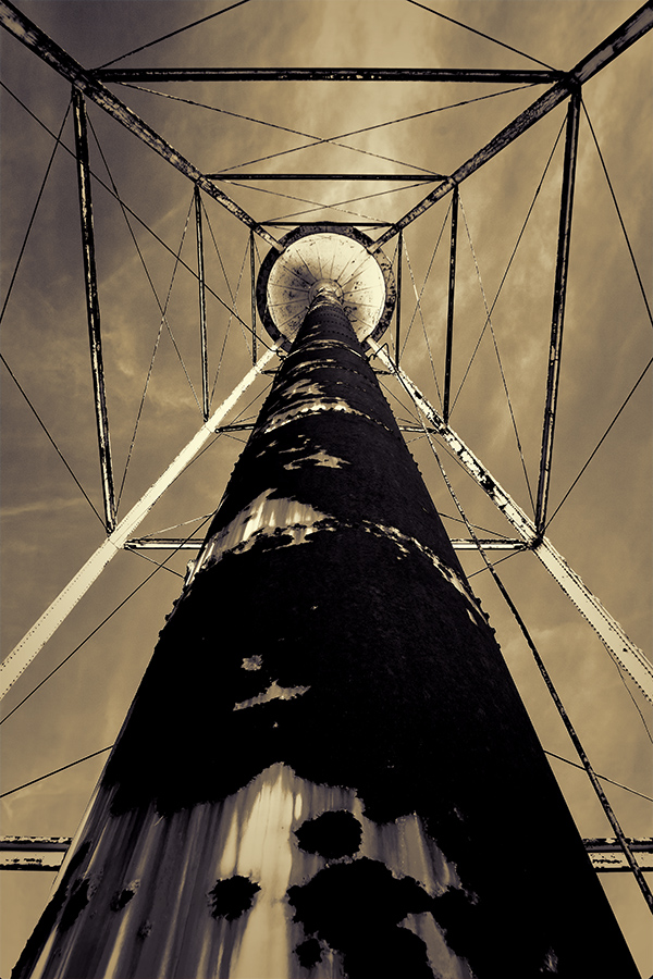 Since I was a bit tired when I got off of work today, I wanted to find something to shoot on my way back to my hotel instead of going out later. The sun was about to set and the strong sidelight was great but in order to take advantage of it I had to work quick. Well, I wasn’t quick enough. I thought I would swing through an old industrial area hoping to find some old buildings or abstracts but the road I first took didn’t end up where I thought. It was a dead end. By the time I found my way to where I wanted to be the sun was almost set. So much for dramatic light. I was near this old water tower, which I had shot previously for a 365 (365-227) but decided to shoot it at a different angle this time. This is your standard “shot from below dramatic angle shot”. Nothing original but I like the symmetry which turned out rather well. I’m usually sloppy on details like that! I was going to do a color shot but I thought I would try a split-tone B&W treatment instead, which I think adds a little more drama. Pentax K20D, DA17-70.