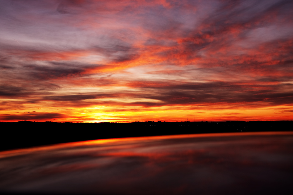 I’ve been  working on a project and literally stuck in one place the past few days, from dark to dark. With the exception of lunch break, I don’t really have the opportunity to stray too far so I’m doing my best to come up with something interesting. The one highlight is that I’m on top of a hill with a nice view and I get to see the sunrises and sunsets everyday. I took todays photo of the sunrise as it was reflecting in the hood of my truck. the reflection helped balance the photo and reduced the black horizon a little. So todays photo is just about color, provided by nature.  Pentax K20D, DA18-135.