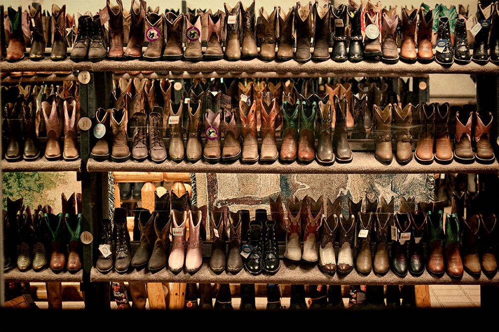 There is a western wear store near where I’m working that has a large display of boots that can be seen through the large store window. I spotted them coming home from work one evening and thought I would be able to get a nice shot of the boots from outside. It’s usually too busy in the evening and the traffic reflects in the window too much to try to attempt a photo then, so when I saw that the lights inside were on in the early morning today, I thought that would be a good time to get a shot, since no one was around and the traffic was almost nonexistent. It was still fairly low light so I used the Super-Takumar 50mm lens around f/2 and a higher ISO to get the shots. Now excuse me while I go play some Van Halen on my guitar…..sans boots 😉