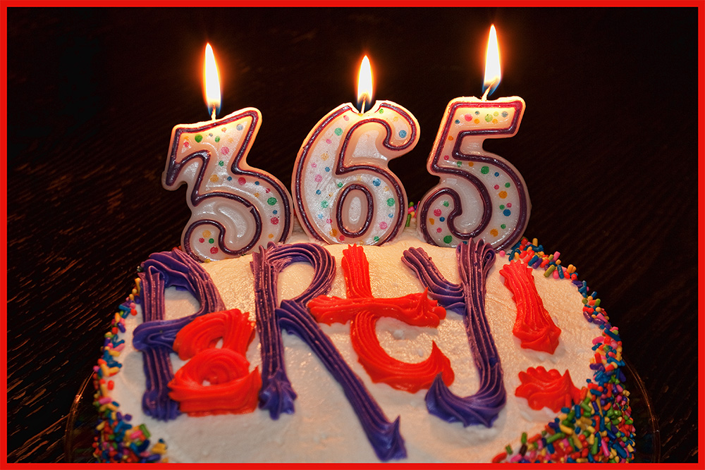 I’ll start off with the photo today. I thought a festive shot would be a fun way to wrap up my 365 project. I know a lot of people like to show all of their prints sprawled out on the floor and spelling out 365 or they do a montage of the years pics, but I thought what’s more fun then a cake? And considering my normal subject matter of rougher, worn things, a nicely done professional cake just wouldn’t look right, would it? So I like that it’s not quite perfect. It looks just right to me. And I don’t normally do borders but a nice color coordinated border adds the finishing touch! Pentax K20D, DA17-70, fill flash.