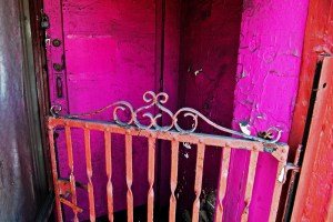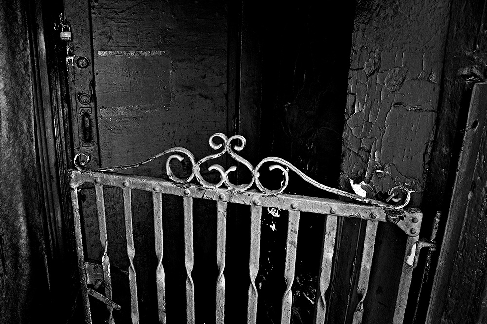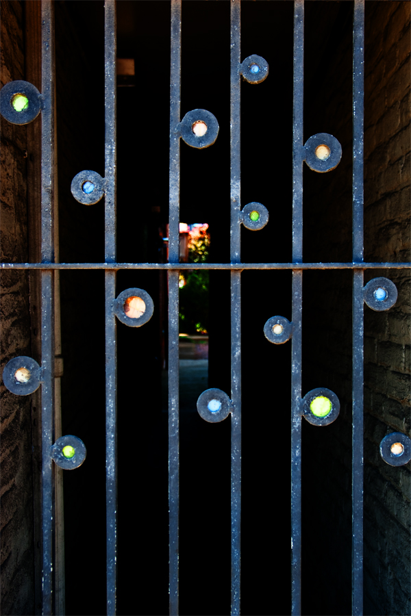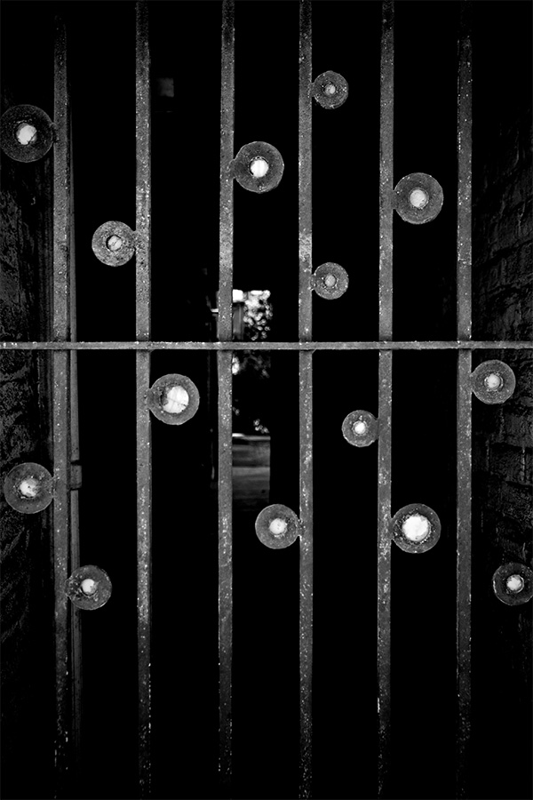 In the mean time, I found some photos I took in Pittsburgh last summer. I originally processed these in color but I was curious how they would look in black and white.  The first shot of the gate and doorway was all about color. The brightly painted walls were the subject, but it takes on another look completely in B&W. The second shot of the iron gate had subtle color, especially in the glass inlays but the B&W leads the focus to the lines.