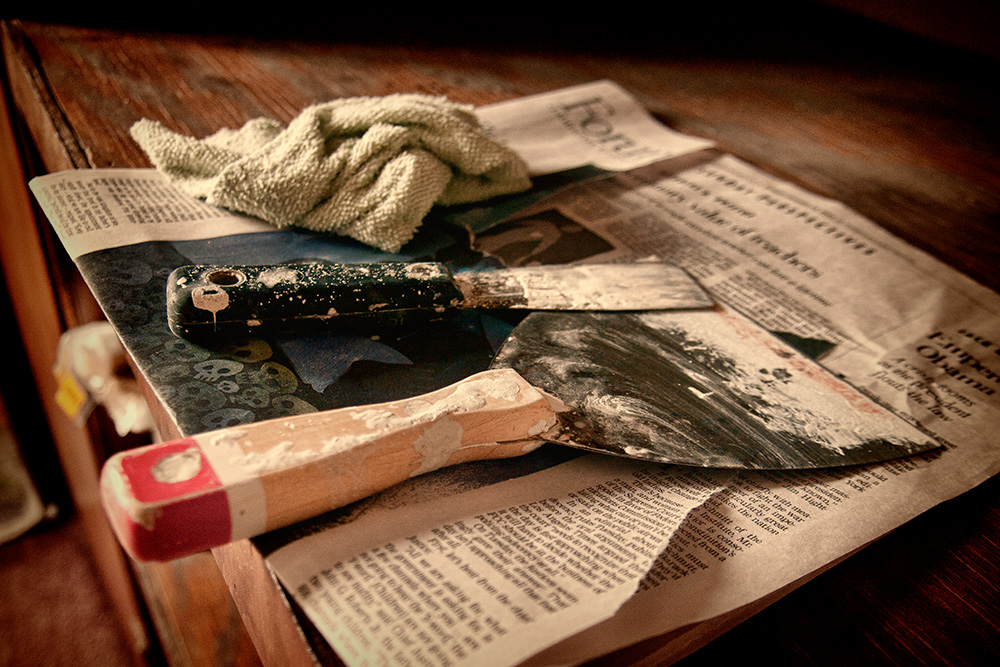 I especially like the top two shots. Great composition in all, but the roll of dry-wall weave & scissors and the putty knives on the newspaper just grab my attention more.