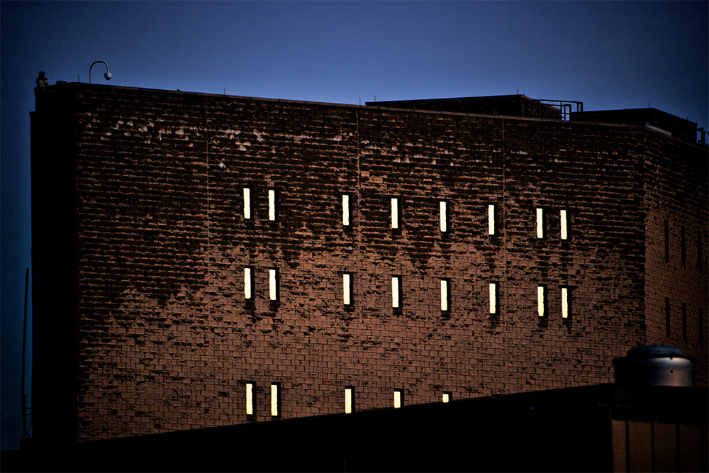 While we were out, my wife had to stop at the drugstore and I just waited in my truck as she ran in. While waiting, I noticed the windows of a few buildings downtown were reflecting the light from the setting sun. From my one vantage point I took both of these photos, slightly underexposed to enhance the bright windows. Again I wasn’t shooting in ideal conditions. The light level was low enough where I had to boost the ISO, yet the shutter speeds were still pretty slow, considering I was shooting at full telephoto with my DA55-300 lens. The cameras image stabilization helped a lot in this situation but in hindsight I could have kicked the ISO up a little more for faster shutter speeds. I purposely kept the ISO to 800 because I knew the blank sky would show noise but, due to the lack of detail, I could have simply did a separate, more extreme noise reduction only on the sky during processing if I went with a higher ISO. Processing was limited to some noise reduction and playing around with contrast and levels, being careful not to “correct” the exposure. I didn’t pay attention to color much, hence the purplish sky in the first photo. The statue in the first photo is George Washington, which is on the courthouse behind the building. The second photo is the county jail. Pentax K20D, DA55-300.