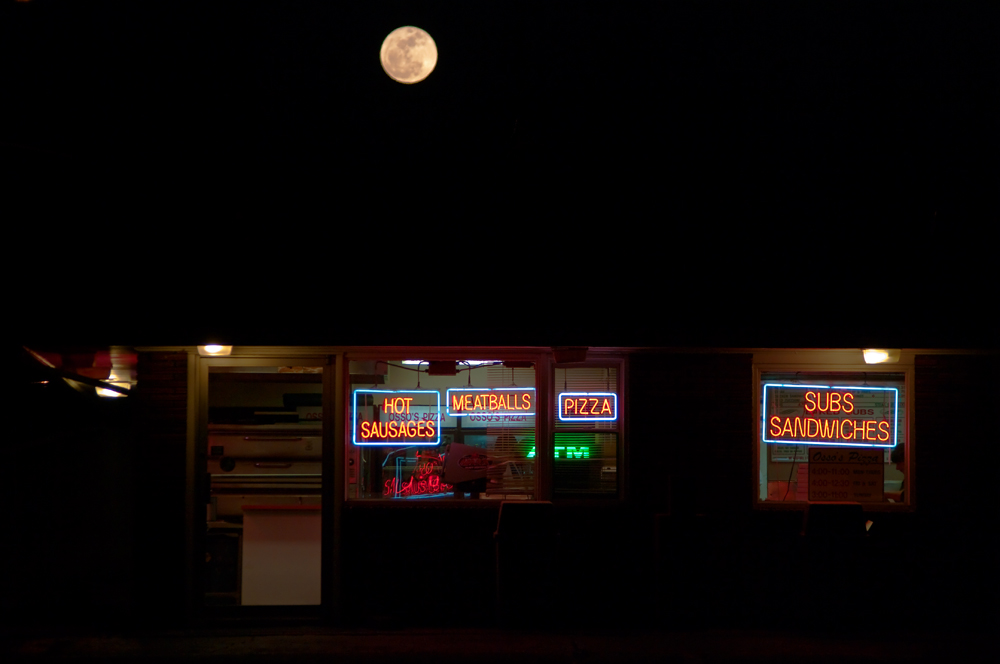 I looked around the sky and couldn’t find the moon anywhere. I walked around my house and tried looking behind the nearby houses and buildings but I couldn’t find the moon anywhere. I thought I had missed it or it was obscured somewhere and I was ready to walk back into my house when I spotted the moon just starting to rise above the pizza shop across the street! Once it rose above the shop I snapped a few photos handheld at a fast enough shutter speed to capture detail in the moon which, of course, would leave everything else in shadow. But the neon lights and interior of the shop were bright enough to be preserved, making the pizza shop a perfect foreground element. Plus I got an instant cool song reference for the shot!