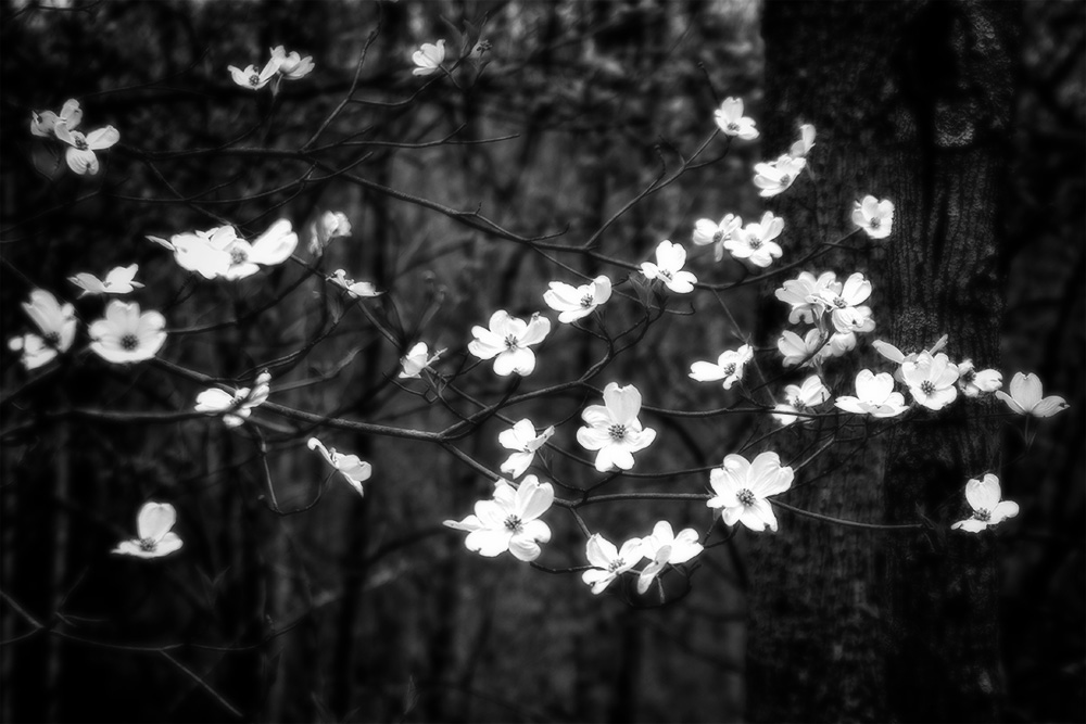 This photo is one of those scenes that ACR couldn’t average. The auto setting wanted to bring the wooded area towards middle gray which totally washed out the contrast with the flowers. It may have even been technically correct, as the woods were not that dark, but not what I had envisioned for the scene. So I worked the sliders manually, setting the brightness, contrast, and black points to where I thought the image looked good. Yeah, I just used my eyes! I wanted to enhance the contrast between the flowers and the wooded area without washing out the bright white blossoms.