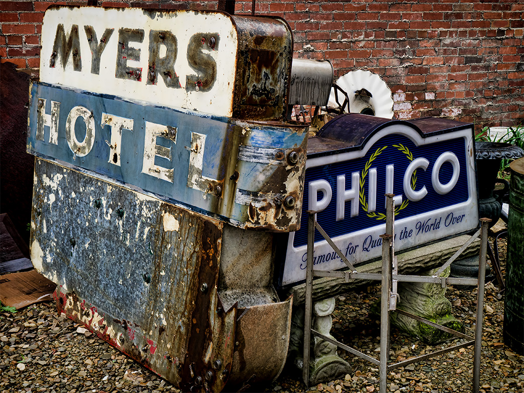 Today I drove through a town that I haven’t been to before. A small, nice looking town that looked like it had a lot of photo possibilities within it but, unfortunately, I didn’t have the time today to explore. It’s a few hours away from where I live so I may return on my own time some day. After spotting numerous photo ops all day long while I was working and not being able to shoot them due to road and time constraints, I was glad to finally spot something that I could easily shoot while on my way back home. These signs in an alley next to an antique store popped out at me as I drove through town and I was able to park on the street nearby and grab a few shots. The compositions aren’t that great because it’s difficult to compose with so many elements in the frame and I realized that I MUST get a viewfinder for the Lumix GX1 because I never can see all of the details in a shot when using the LCD only. Regardless, I thought they looked kind of cool and figured I would share them here.