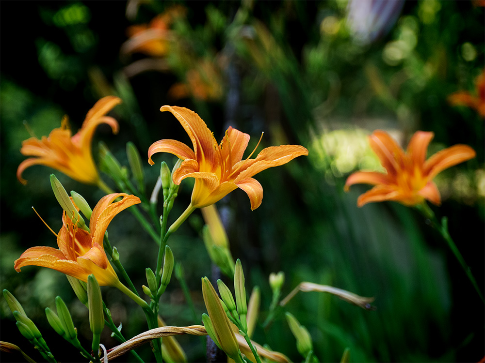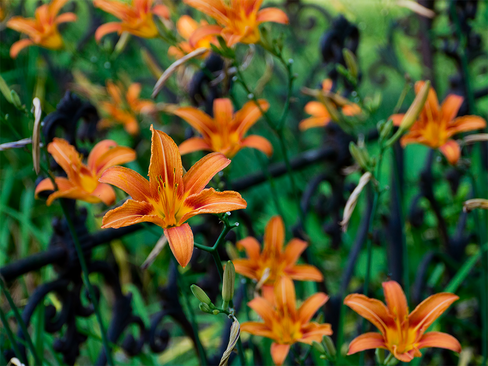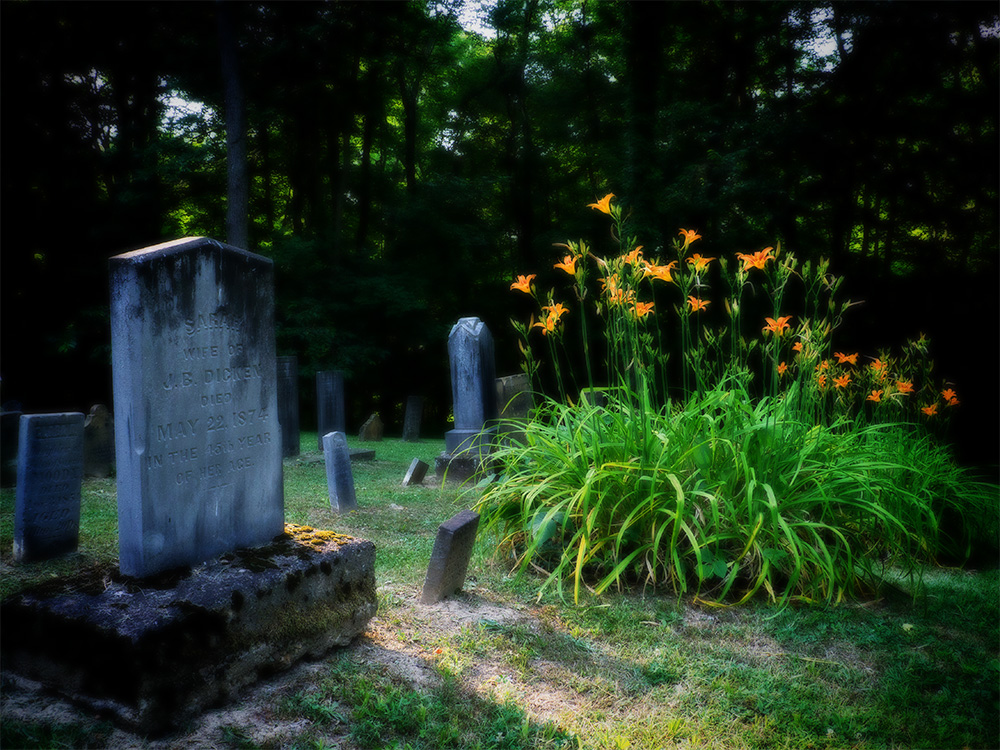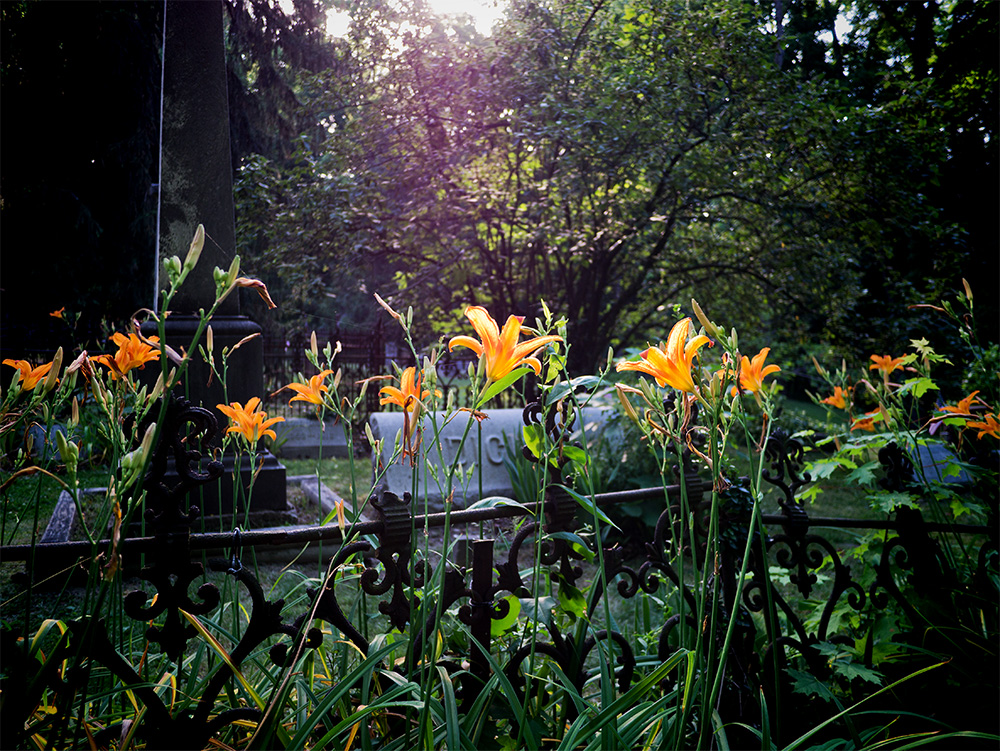 I have been a little heavy on the black and white lately so I decided some color pics would be nice. And what’s more colorful than flowers? Astute readers may note that there are graves in the photos and are probably thinking, “geesh, is that guy in the cemetery again?” Well, not really. I was in Columbus for a vintage guitar show on Sunday and stopped by an arboretum on the way home. I thought I would try some nature photos and I actually had black and white in mind when I was taking them, since the subject matter was primarily trees. But this small graveyard is a part of the grounds and when I saw the tiger lilies, I instantly liked the contrast of them with the surroundings and that’s why I deliberately didn’t take any closeup photos of the flowers. Besides they were a bit past their prime. I’m also including a pic I grabbed at the greenhouse on the way out. It’s doesn’t fit with the others, but it does have flowers at least.