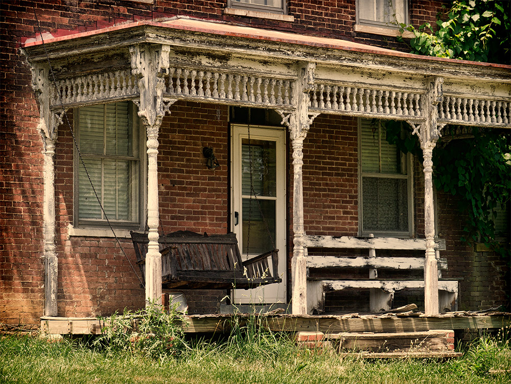 The photo I took in the past was a straight on shot of the entire porch. I didn’t care for the photo and couldn’t figure out why it didn’t show what I thought I saw. It was a too quick shot taken during a drive-by and wasn’t that good technically, but I realized the straight on shot just didn’t work. So I knew I had to try again when I was in the area. As I approached the house today I immediately realized the angle from the approach was the one I needed to get the right feel, not the straight on shot. Along with a little tighter composition instead of trying to show the whole front of the house, which put more emphasis on the old swing.
