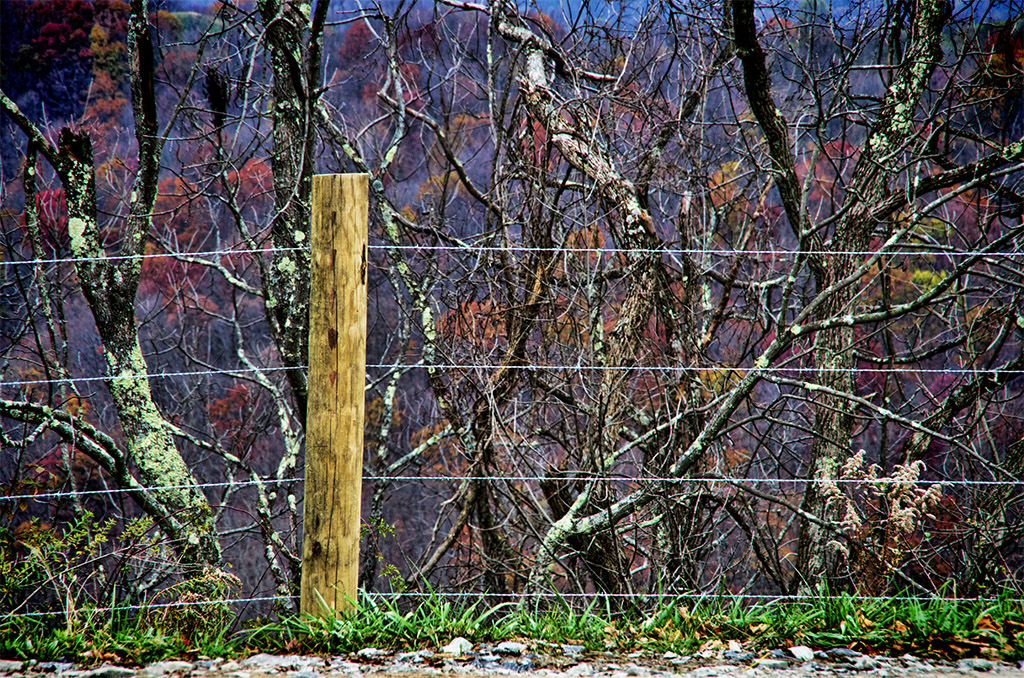 I saw this farm fence today and I thought the location of it warranted a photo. The fence itself is nothing unusual, just the normal post and wire ensemble, but as you can tell, the background sure looked crazy. The fence is on the side of a country road and immediately behind it is a ravine, where the large, scraggly tree is situated. Behind that you can see the hill across the wide valley. All together it looks strange to me. Kind of psychedelic….man.