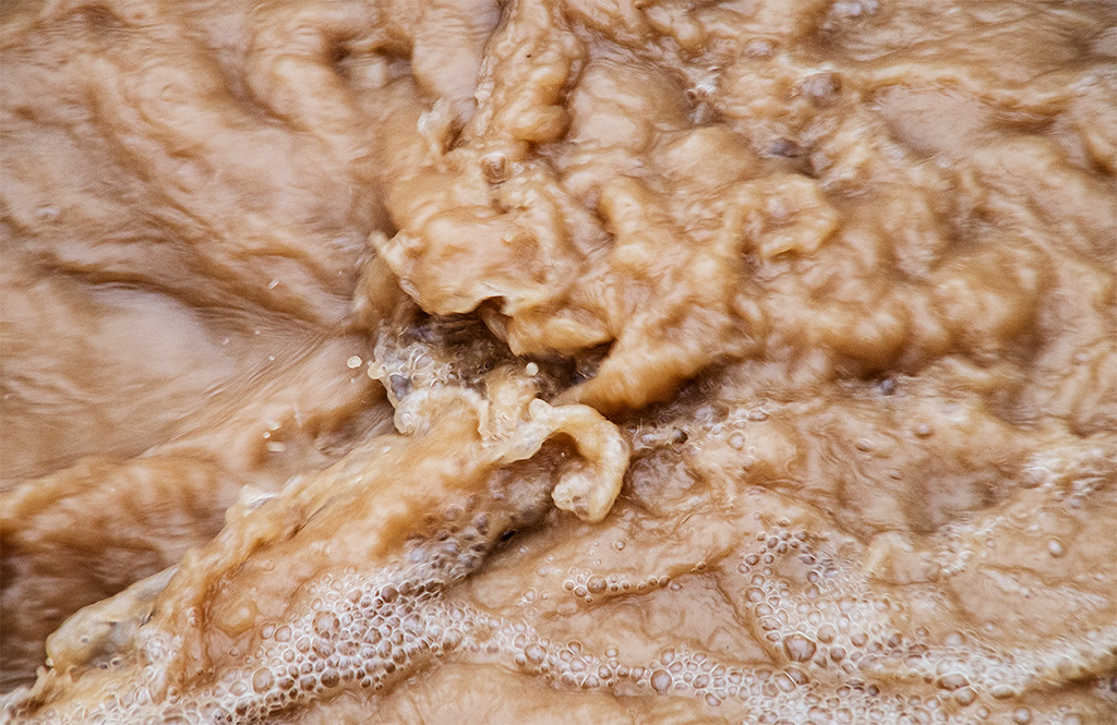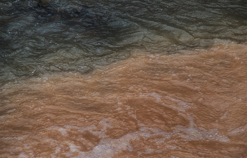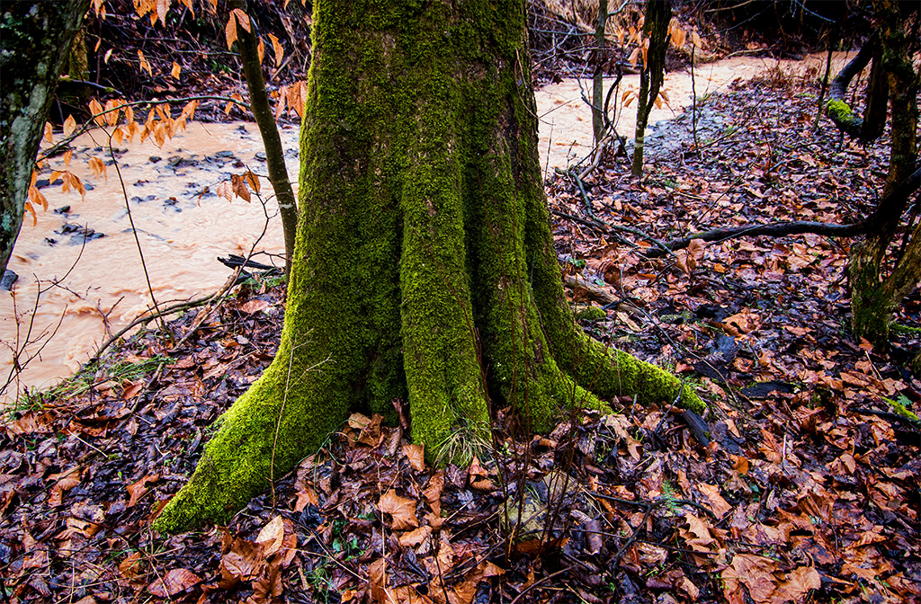 There’s nothing like a good rainfall on a January day in the West Virginia hills to stir up a little mud. Of course, artistically it leaves a lot to be desired. Just a monotone brown color oozing everywhere. But I found a colorful tree to add a little punch and some churning water, which helped to add a little visual “action”.