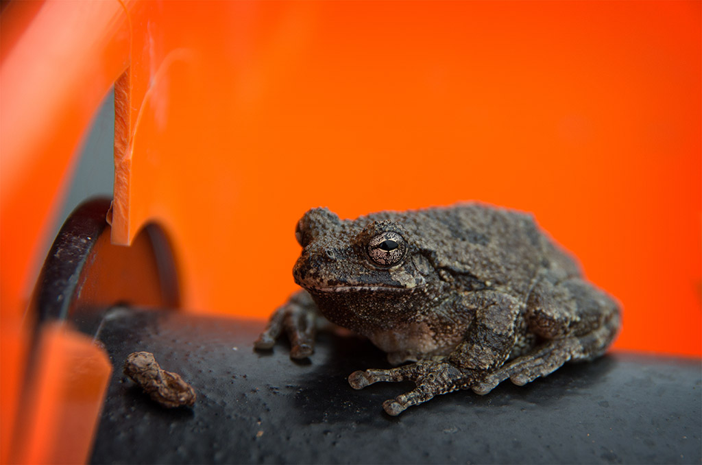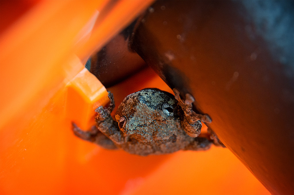 It was a pleasant surprise to open a container at work and find this little guy sitting on a pipe. At only 2-3″ he didn’t take up much room and certainly wasn’t in the way. I thought the orange background was different enough from the usual toad photos to grab a portrait. He posed for a short while but eventually got nervous and started jumping around. He was last seen hanging around.