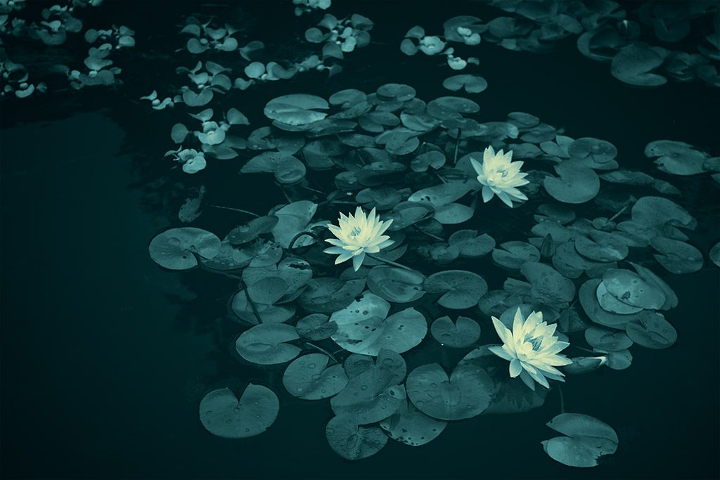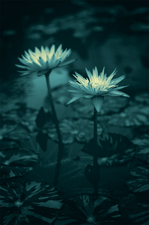 All that being said, this years outing was satisfactory but I wondered what I could do different in the processing department. I saw that the contrast of the flowers top the background was high enough to make for interesting black and white images. After I started that process I wondered almost immediately what a toned monochrome image would look like. When I hit on the teal tone, I knew right away that was what I was after. The flowers practically jump out of the photos due to the contrast. They seem to almost glow against the dark water.