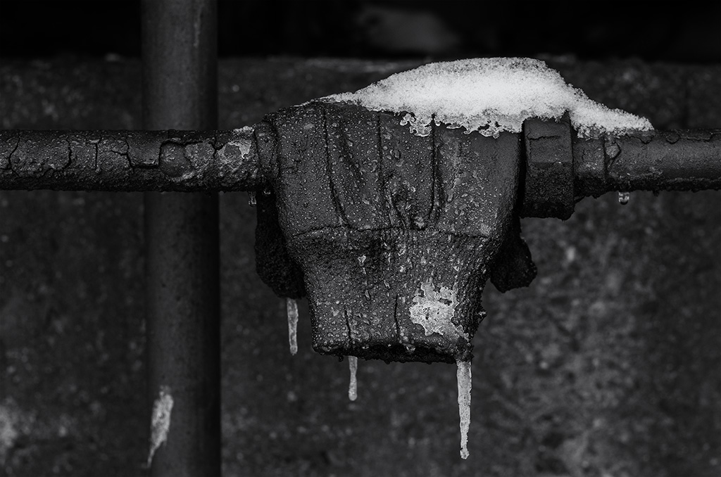 I took a similar photo of this glove over 3 years ago (without the snow) and I was driving by the area the other day and noticed it was still in the same spot, in the same position. The glove is sitting on some pipes by oil tanks behind a building in town, but it’s out in the open and easily seen by passersby. I don’t think the tanks are being used anymore, which may explain why nobody has tampered with the glove, or anything else in the vicinity for that matter. Considering it has been exposed to the elements all these years, it looks like the oil is working as a good preservative!