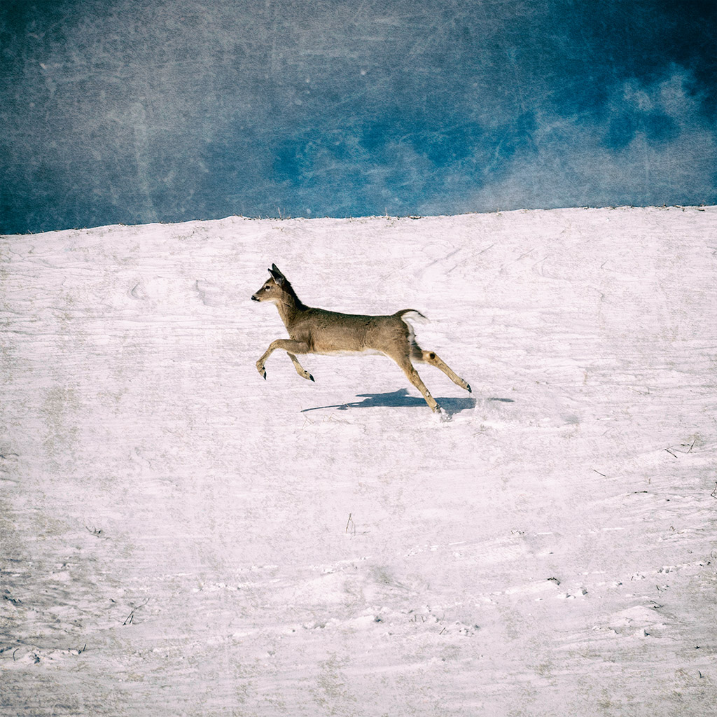 With the contrast of the snow, deer, and sky I immediately thought it would make a good black and white image. It does for the most part so I experimented with different contrast to keep it graphically simple. While processing I realized it worked best as a square composition, something I’m “freeing my mind” towards. When I had a black and white image that fit my vision, I thought I was done but for some reason wondered what I could do with it in color. That’s when I played around with some Nik software and came up with this. I ended up liking it more than I thought I would.