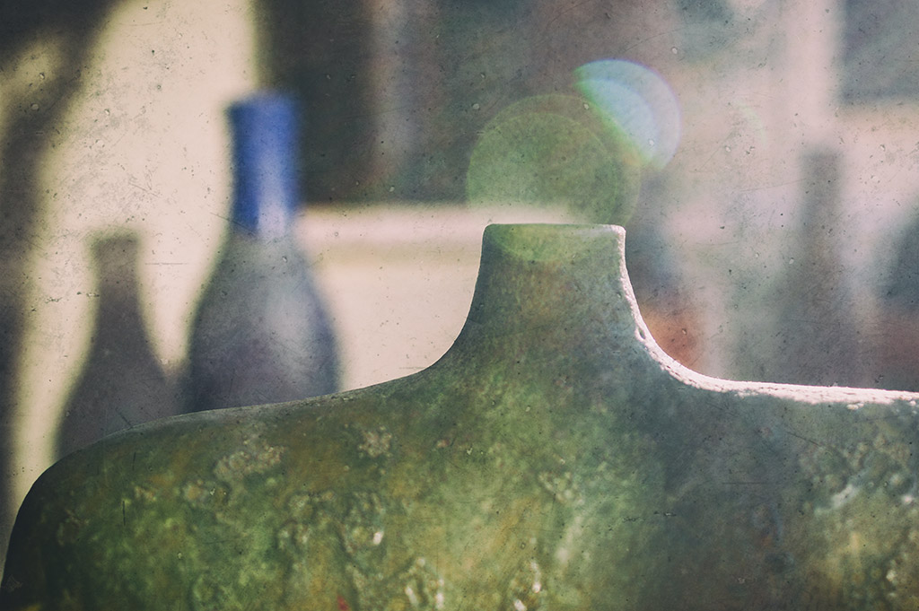 Bottles and vases are always good for a still life photos and this setup was no exception. I’m not too thrilled about the lens flare but maybe it enhances the southwest feel of the late afternoon sunlight which was streaming through the window to the right. Muted color and texture were combined to create this simple composition. Shooting through a dirty shop window also played a part!
