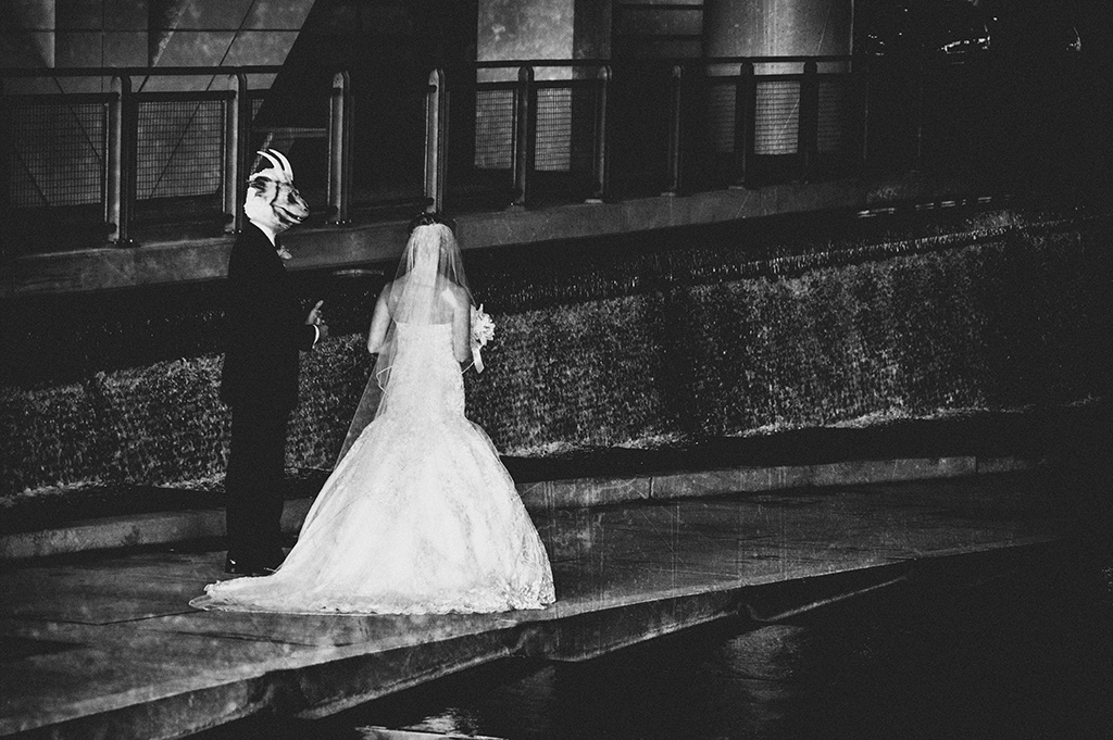 I had this idea to take this bride and groom photo that I shot while walking around Pittsburgh last weekend and add a Furry head to the groom. I looked in my files of Furries street shots to find just the right head at the right angle and came across this goat-like thing. That was the easy part. My Photoshop skills for something like this are severely lacking and I was put to the test. Using only Photoshop Elements (someday I’ll upgrade, after a computer upgrade) I did the best extraction I could of the head and tried to work it into the image. I can’t justify any masking specific software because I don’t do this thing often enough, so I work with what I got.