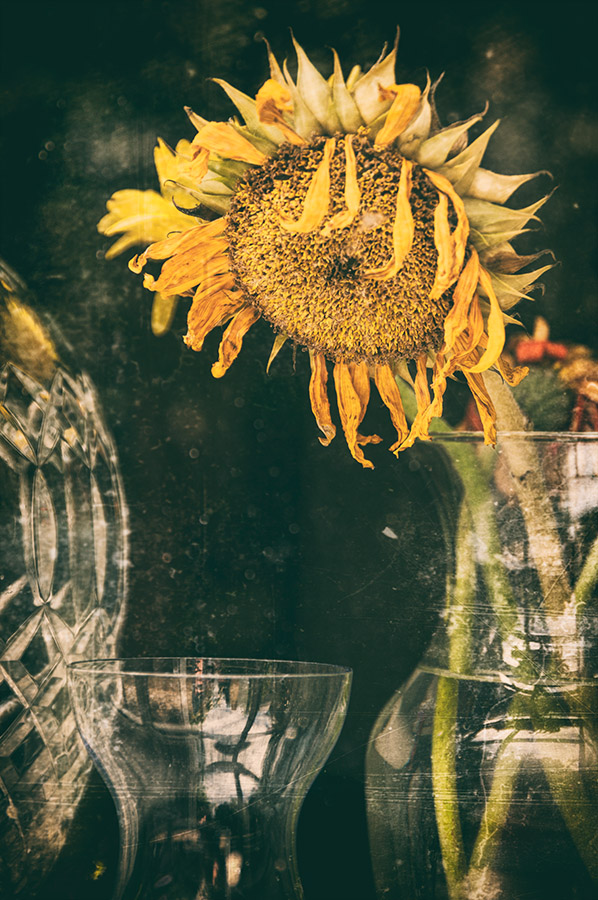 My latest portrait oriented photo is an aging sunflower I spotted in an antique store window as I was walking by on the sidewalk. I shot through the window and my first shot was actually a landscape oriented photo because I wanted part of the weathered window frame in the picture. But there was too much reflection in the glass of the street behind me, so I switched the camera around, shaded the window somewhat, and just focused on the subject. Bingo!