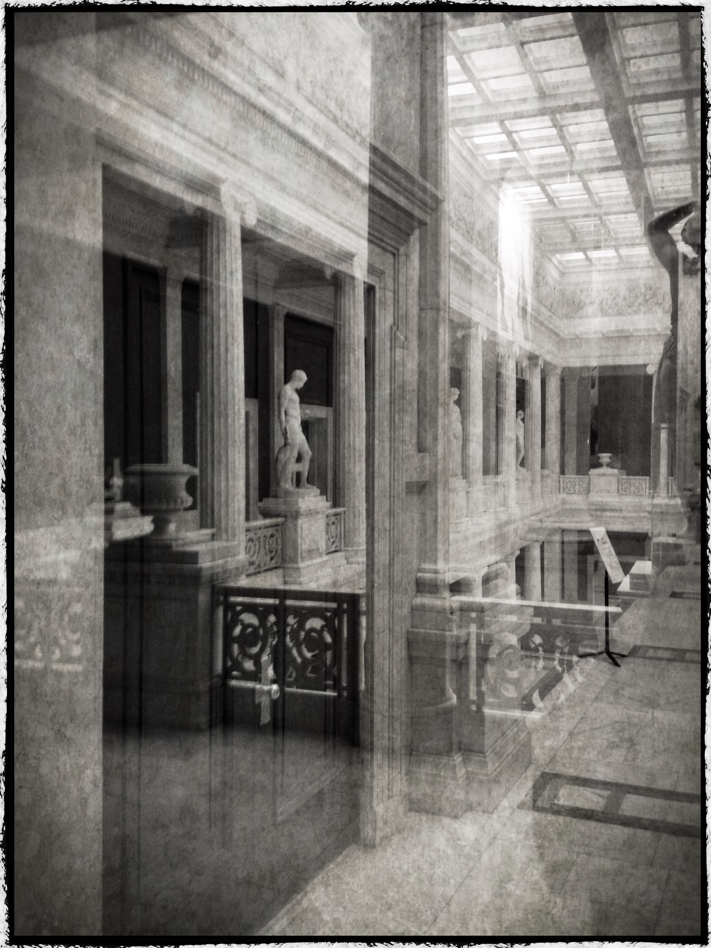 This photo was taken during a visit to the Carnegie Museum of Art when I went to view a photography exhibition. After viewing the exhibition my wife and I like to peruse the other displays while we are there. Man, those dinosaurs were big! Moving on, as I was about to go through some glass doors into the next area. I like how they reflected the statues that were behind me, so I snapped a quick pic with my phone. A few twiddles of my thumbs using Toaster filters and, voila, instant art!