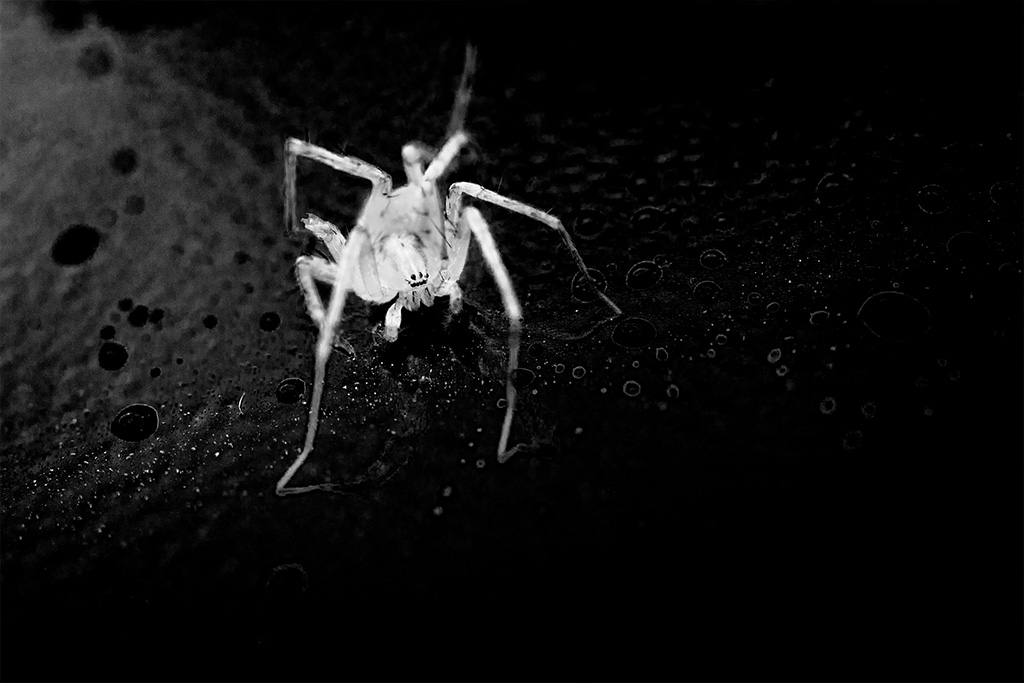 This shot was an instant black and white moment.The spider was yellowish and the black metal reflecting the daylight was bluish so I knew right away that I could get a nice contrast in black and white. B&W is fun when there are only two colors in the scene!