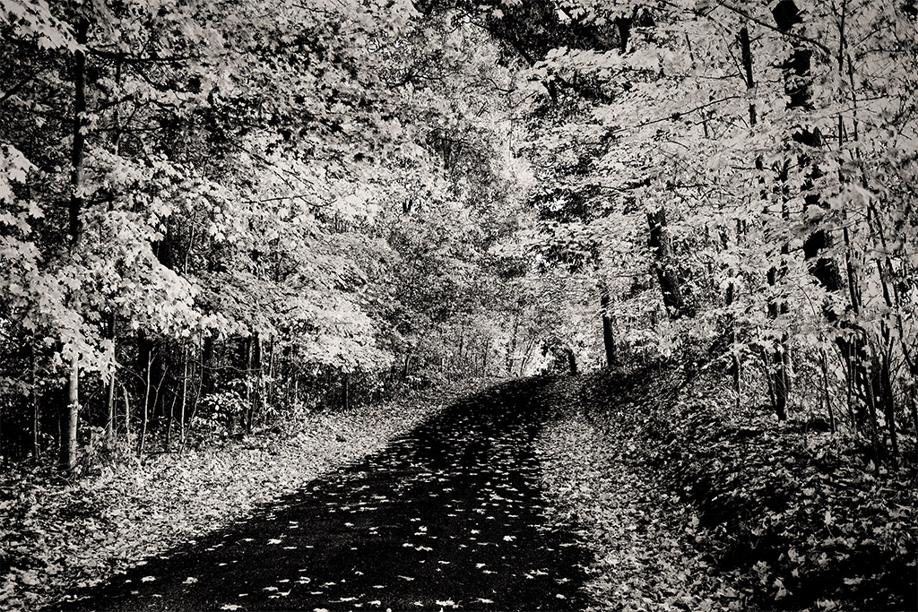 I snapped this photo of a rural road today as part of my annual autumn theme photos. Since it’s still relatively early in the season the color wasn’t quite fully developed and a lot of the leaves were still green. The scene was nice but not nice enough. Instead of a wasted shot I wondered what the photo would look like in black and white, considering the wet road was nice and dark and would make a good contrast.