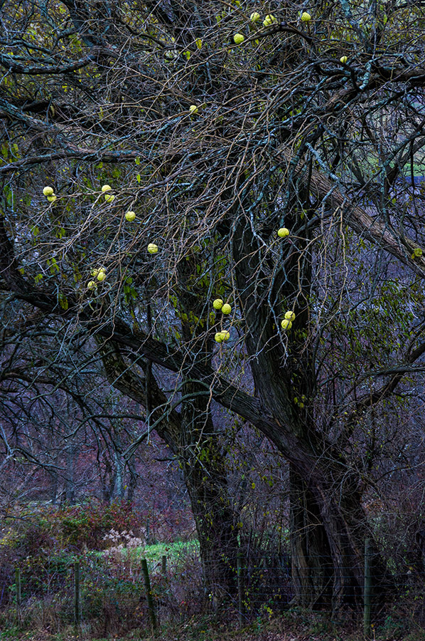 I find the trees quite picturesque, with their scraggly branches and the bright yellow fruits glowing in the autumn sun. After all of the leaves have fallen is when they really stand out. I’ve seen a number of good ones that would have made for a good photo but unfortunately I was usually doing my day job and I couldn’t simply stop to take a photo, let alone trespass on someone’s property. But the other day I was able to grab this photo and although I like the composition I can’t help but wonder what it would have looked like with more balls. Just a few weeks too late.