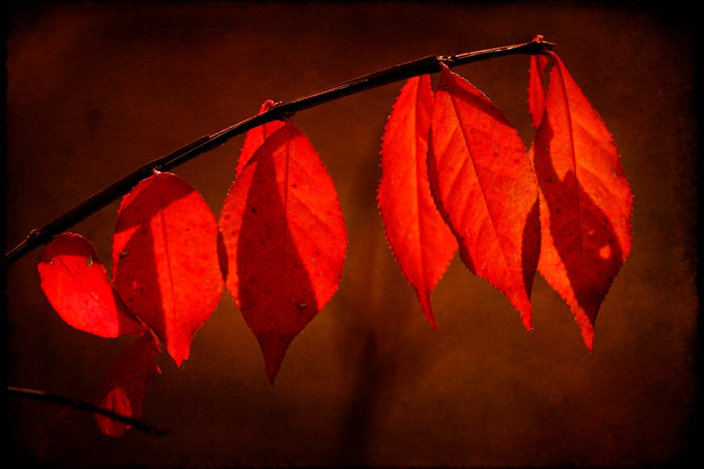 During processing of the photos I found one photo of the backlit leaves that looked interesting. After my usual straightforward processing it did indeed look pretty good. But after staring at the photo for a while I decided to try something I haven’t done much of lately – adding some texture layers. I wanted to keep the image darker and the textures a little less obvious, so I experimented until I ended up with this result: