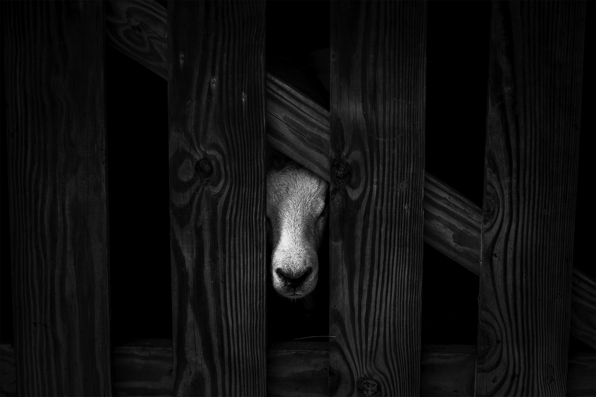 I took this photo at the local fairgrounds last summer the day after the county fair was over. I like to walk the grounds after the fairs to look for interesting things to photograph. After shooting some rides in disassembly, I spotted some local farmers loading up their show animals to take back home. This little guy (gal?) was waiting his turn to get on the trailer and looked curious towards what I was doing. A perfect setup for a perfect portrait. The simplicity of the composition lent itself easily to a black and white image.